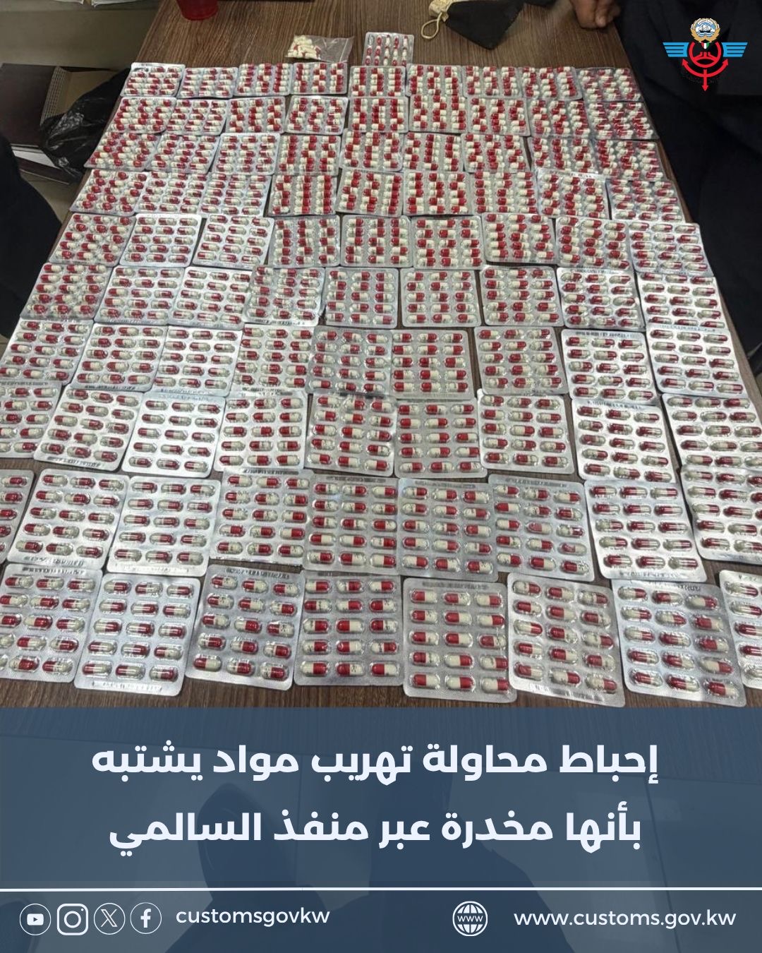 تمكّنت الإدارة العامة للجمارك من ضبط مسافر أثناء قدومه إلى ساحة التفتيش عبر منفذ السالمي قادماً من المملكة العربية السعودية، وخلال عملية التفتيش، عُثر بحوزة المذكور على عدد (1391) حبة تقريباً يُشتبه...