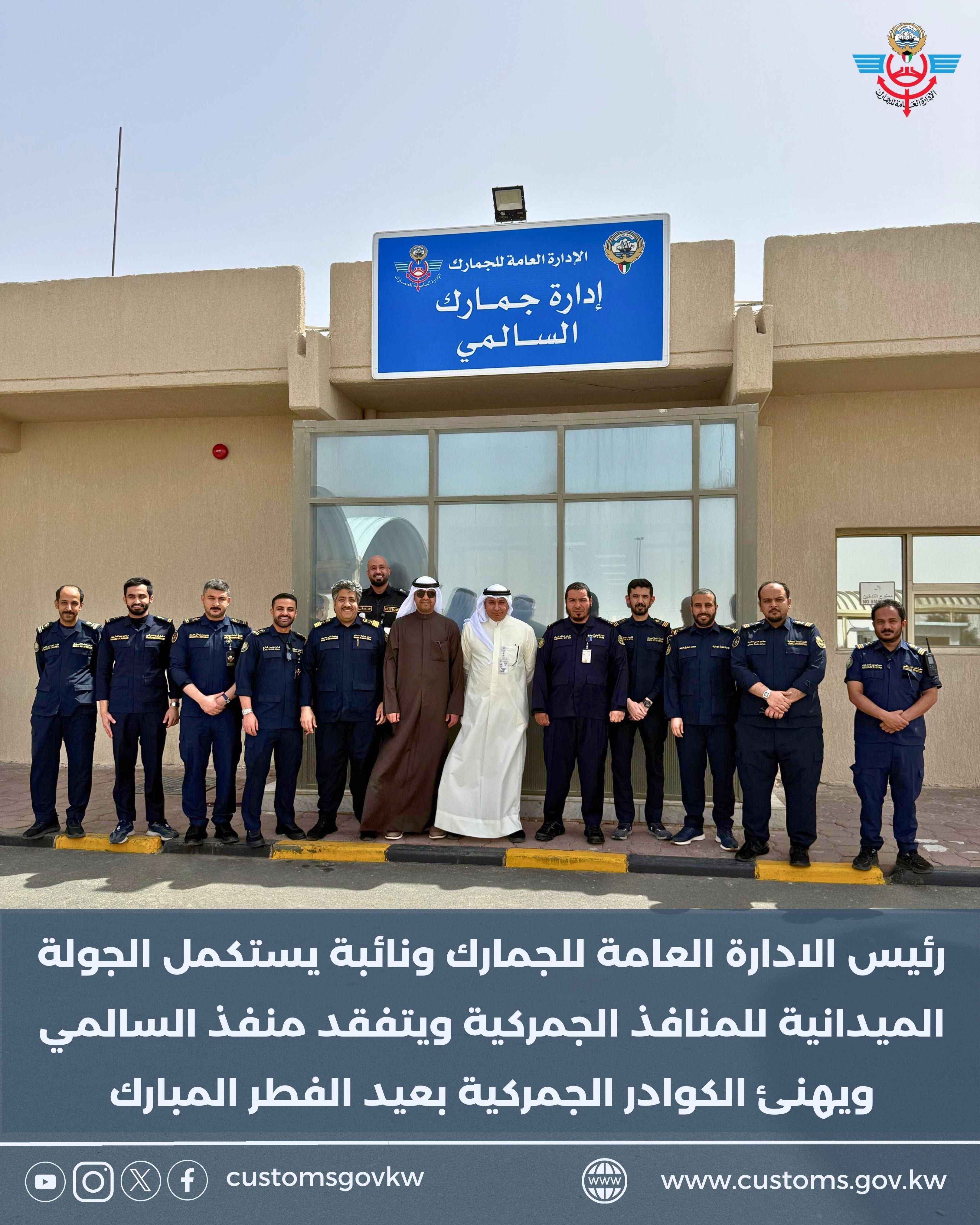 رئيس الادارة العامة للجمارك ونائبة يستكمل الجولة الميدانية للمنافذ الجمركية ويتفقد منفذ السالمي ويهنئ الكوادر الجمركية بعيد الفطر المبارك استكمالاً للجولة التفقدية والحرص على المتابعة الميدانية في ال...