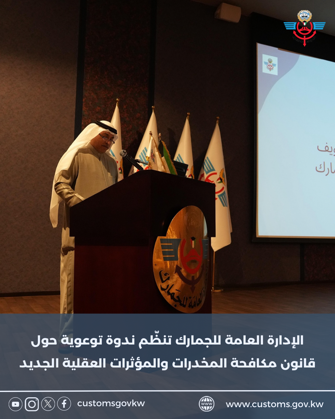 في إطار الجهود الوطنية الرامية إلى تعزيز الوعي القانوني ومكافحة آفة المخدرات، نظّمت الإدارة العامة للجمارك ندوة توعوية بعنوان «قانون مكافحة المخدرات والمؤثرات العقلية الجديد رقم (159/2025)»، تحت شعار ...