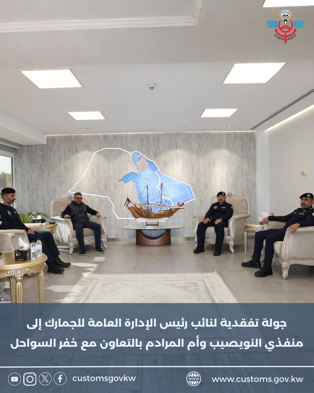 في إطار المتابعة الميدانية المستمرة وحرص الإدارة العامة للجمارك على تعزيز الجاهزية التشغيلية ورفع كفاءة العمل الجمركي، قام رئيس الإدارة العامة للجمارك السيد يوسف خالد النويف يرافقه نائب رئيس الإدارة ا...