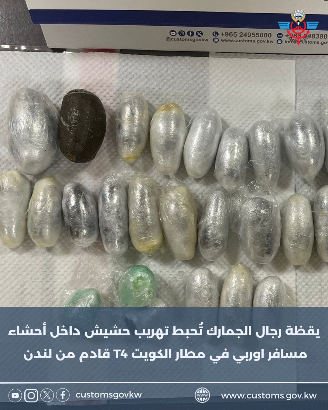 يقظة رجال الجمارك تُحبط تهريب حشيش داخل أحشاء مسافر اوربي في مطار الكويت T4 قادم من لندن