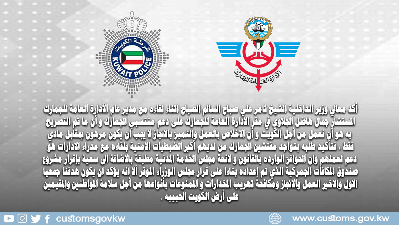 تتقدم الإدارة العامة للجمارك بأسمى آيات التهاني وأجمل التبريكات إلى مقام حضرة صاحب السمو أمير البلاد المفدى الشيخ نواف الأحمد الجابر الصباح- حفظه الله ورعاه-، وسمو ولي العهد الأمين الشيخ مشعل الأحمد ...