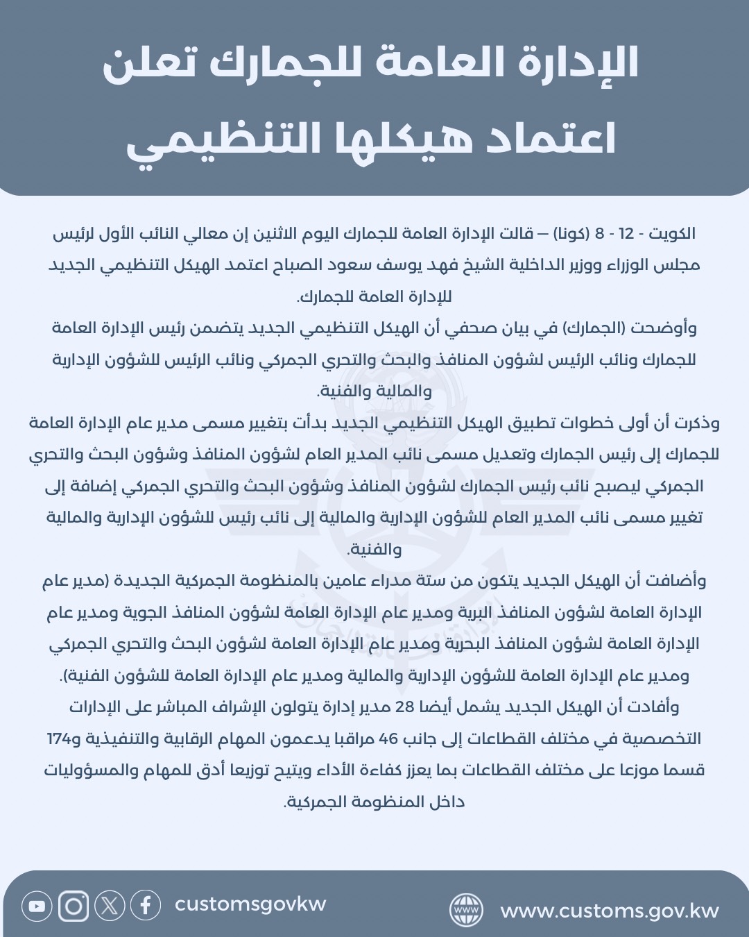 الكويت - 12 - 8 (كونا) — قالت الإدارة العامة للجمارك اليوم الاثنين إن معالي النائب الأول لرئيس مجلس الوزراء ووزير الداخلية الشيخ فهد يوسف سعود الصباح اعتمد الهيكل التنظيمي الجديد للإدارة العامة للجمار...